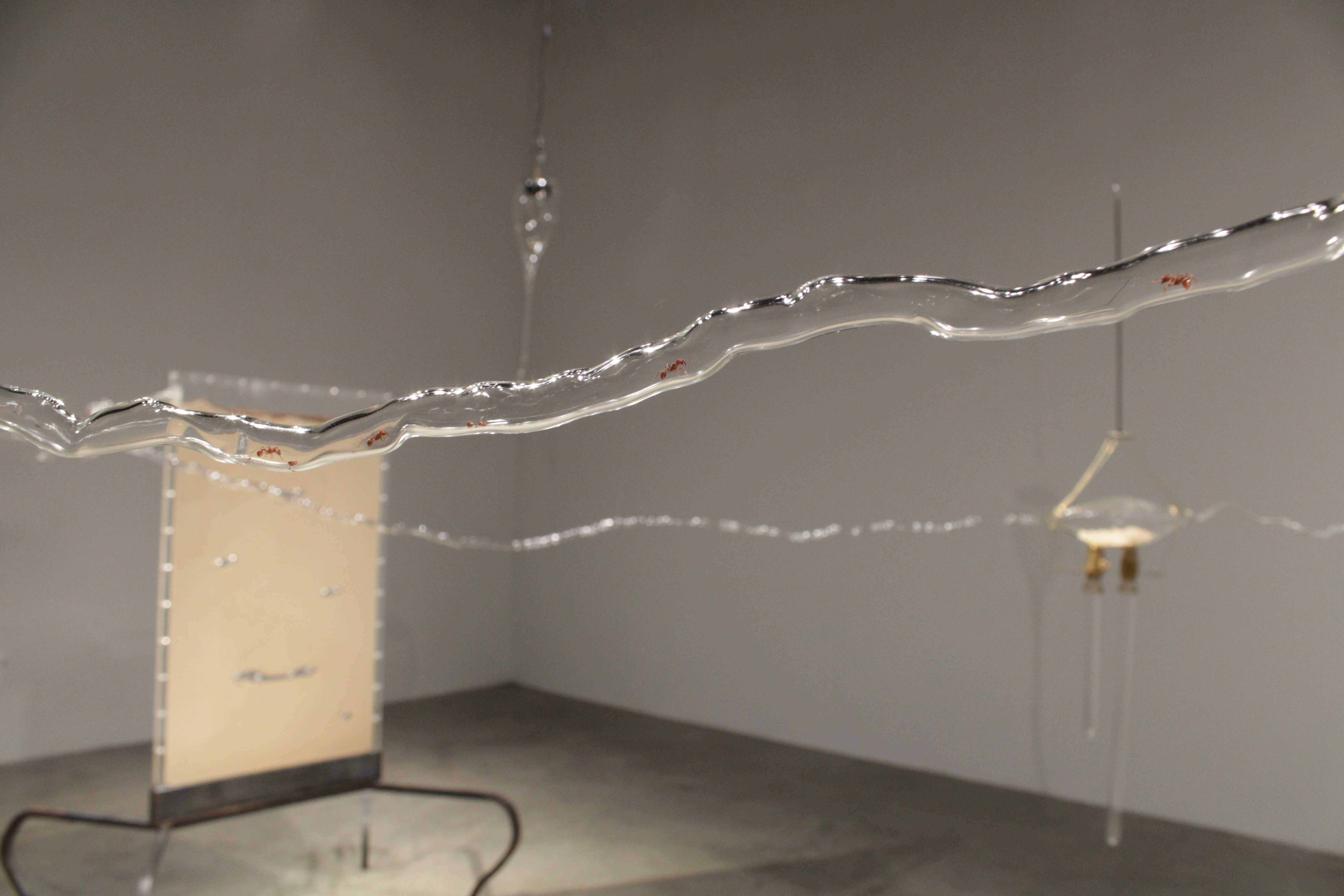 A cast glass sculpture, evoking the reimagining of a womb projecting its process of decay, represents the connection between the artist and her son while simultaneously distorting the image of life’s ephemerality in transition. Through glass tubing, it is connected to a human-scale ant farm that previously housed a colony of ants that fed on agar molded in the shape of the placenta.