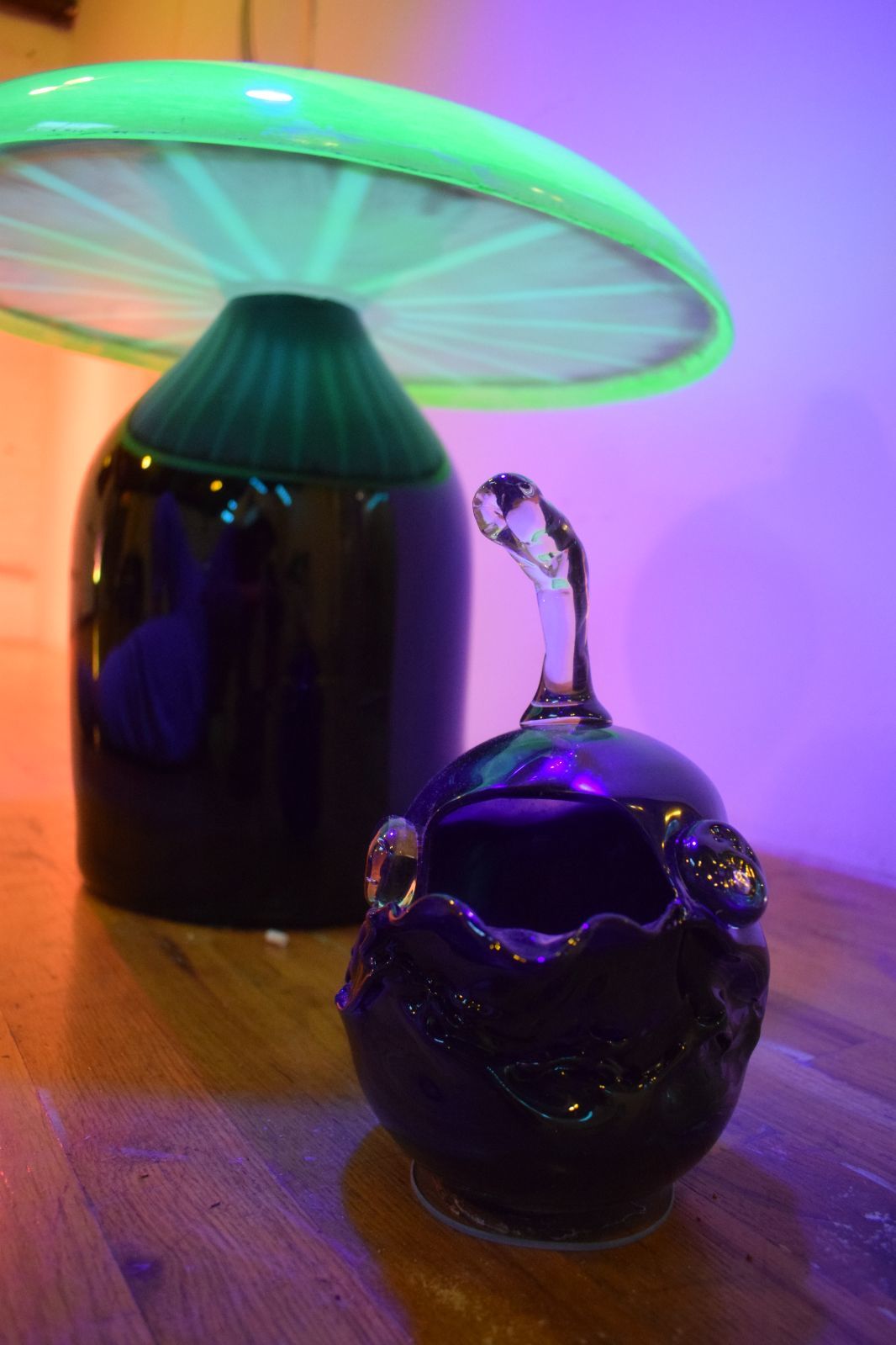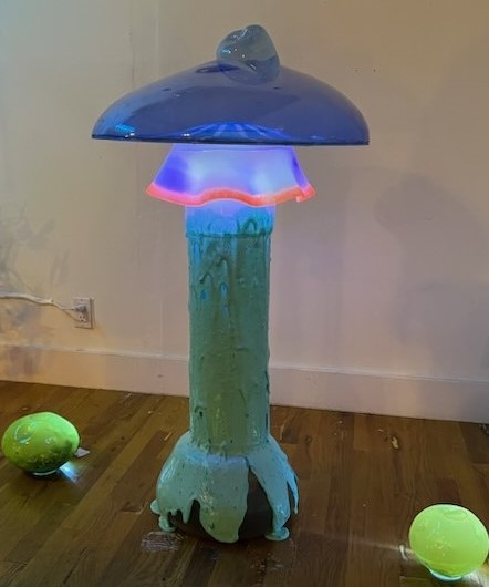 This show is made in the artist's fantasy style of natural figures of Mycelia, Animalia, Flora and Insecta. From the most grandiose in scale, the ‘Toxics’, to the smallest, the maggots and flies, all the show elements are highly inspired by real life. Born from negative situations and also perpetrators of such situations, the Toxics spread the spores of incompatibility further, speaking on dark life-cycles The maggots and flies are more literal as they denote which pieces are 'alive' or 'dead' and what role the light life-cycle plays in the artwork's story. The large spider and web sculptures represent truths, repressed instincts, and also high-level craftsmanship inspired by actual spiders as artists in their own right. Ripe for the Picking is a super-sized, pseudo-ecological, installation that exists to transport viewers into the horribly delightful glass jungle that is created specifically for a fishbowl feeling, window gallery show.
