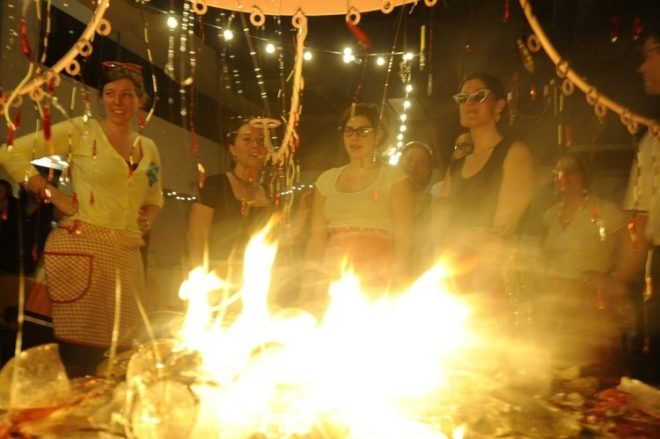 Jessica Jane Julius (far left) and Erica Rosenfeld (far right) with their "Cocktail Table" installation at an early Burnt Asphalt performance.