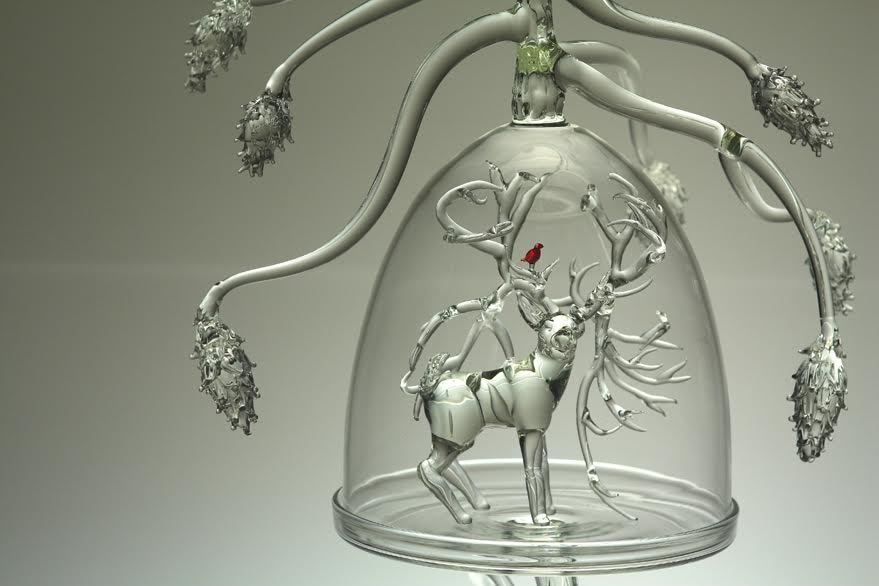 Singer: Karina, did this series of five works "Murmure," which mean "murmur" in English. It looks like a little forest of flameworked and extremely detailed trees. When you look inside the bell jar, it’s as if there are some windswept pines that Tom Thomson painted. But looking closer, you see that these bunches of shapes, it’s not a straight up and down plain tree, but it's as if there’s little mountain of shapes. There are many of these bell forms, and inside are the animals that live in the forest, and all of the animals, rabbit or a deer, any of the animals in the forest have antlers, also branch-like, everything is 100 percent clear glass except for the little birds on the antlers and the branches, and those birds are taken from the Tom Thomson painting palette of colors. So she created the work out of the idea of what would it be like being in Tom Thomson’s shoes. She felt it was something mystical and magical, and so the work is born out of that.