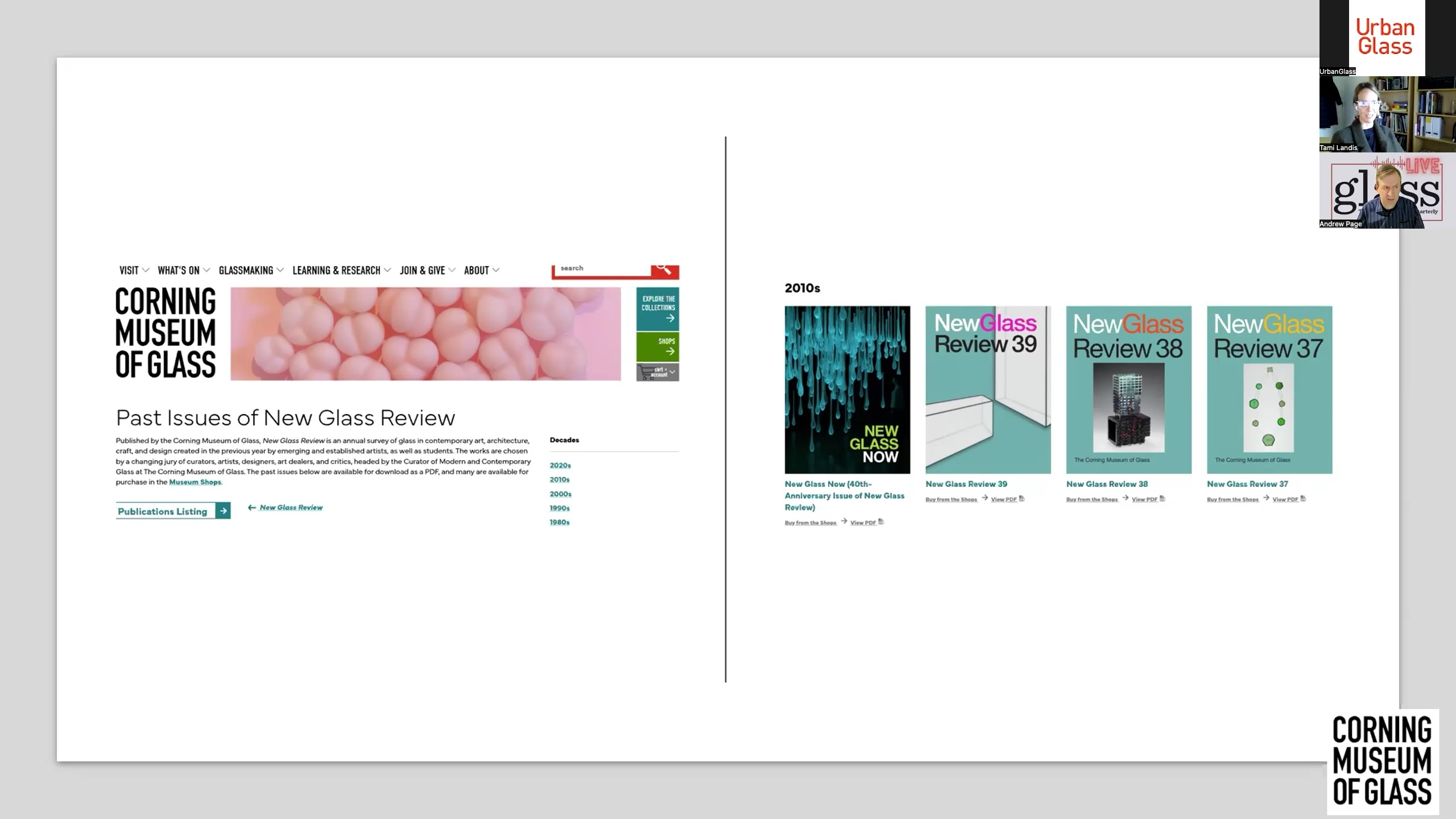 Each year The Corning Museum of Glass receives approximately 1,000 submissions from 50 countries around the world from artists aspiring to be selected for New Glass Review, the annual exhibition-in-print that has been continuously in print since 1980. Curator of Postwar and Contemporary Glass Tami Landis was featured on the fourth edition of Glass Quarterly LIVE!, a recording of which is available for viewing at our YouTube video podcast page. In the hour-long episode, Landis discussed the origin story, history, and latest edition of New Glass Review. She also answered questions about how applicants hoping to be included in the 2026 edition, New Glass Review #46, can put their best foot forward.