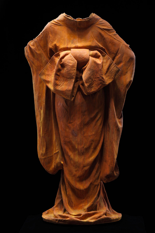 The idea of combining the two bodies of work in one show came from the Hunter Museum's chief curator Nandini Makrandi. In a telephone interview with the Glass Quarterly Hot Sheet, LaMonte noted that it was also her own first time seeing the works side by side — an arrangement she found insightful. Sculptures from both were made through a unique lost-wax casting process, and designed on live models and dresses designed by LaMonte herself. As the Hunter frames it: “The female forms in LaMonte’s sculptures, absent, yet implied through the clinging fabric, raise questions about the role that clothing plays in society, and the impact it has on women’s lives, whether in the east or the west.” The latter point is the deviation from LaMonte’s norm here: while much of her career has been devoted to studying the beauty and transience through the motif of clothing, Floating World, the more recent series of the two, is her first direct confrontation of culture.