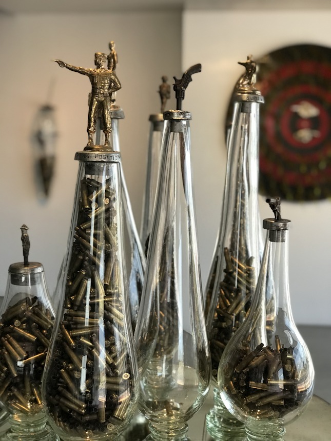 These protest pieces, along with other poignant gun-related pieces such as teacher of the year trophies filled with spent AR-15 rounds and shooting targets depicting children with backpacks, are currently on view at his current exhibit, “The Shooting Gallery,” on display at Studio Inferno through September 1, 2018.