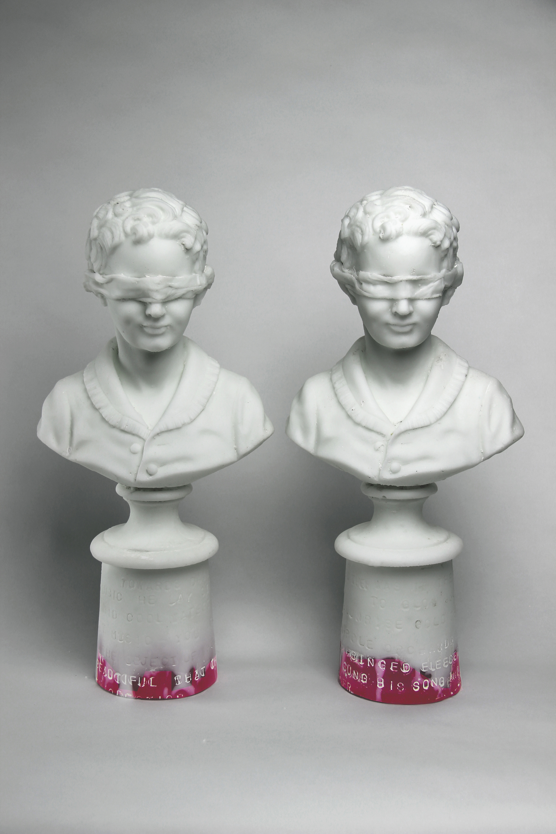 Day's pieces in the exhibit include more bronze work, paintings, and the painted objects he often finds at antique stores and repurposes. In these works, he continues with the theme of childhood innocence, often incorporating twin imagery that his work is known for. In the dual busts Two Boys Blind, Day added the blindfolds to the eyes and added words from James Joyce's The Portrait of the Artist as a Young Man at the bottom in red.